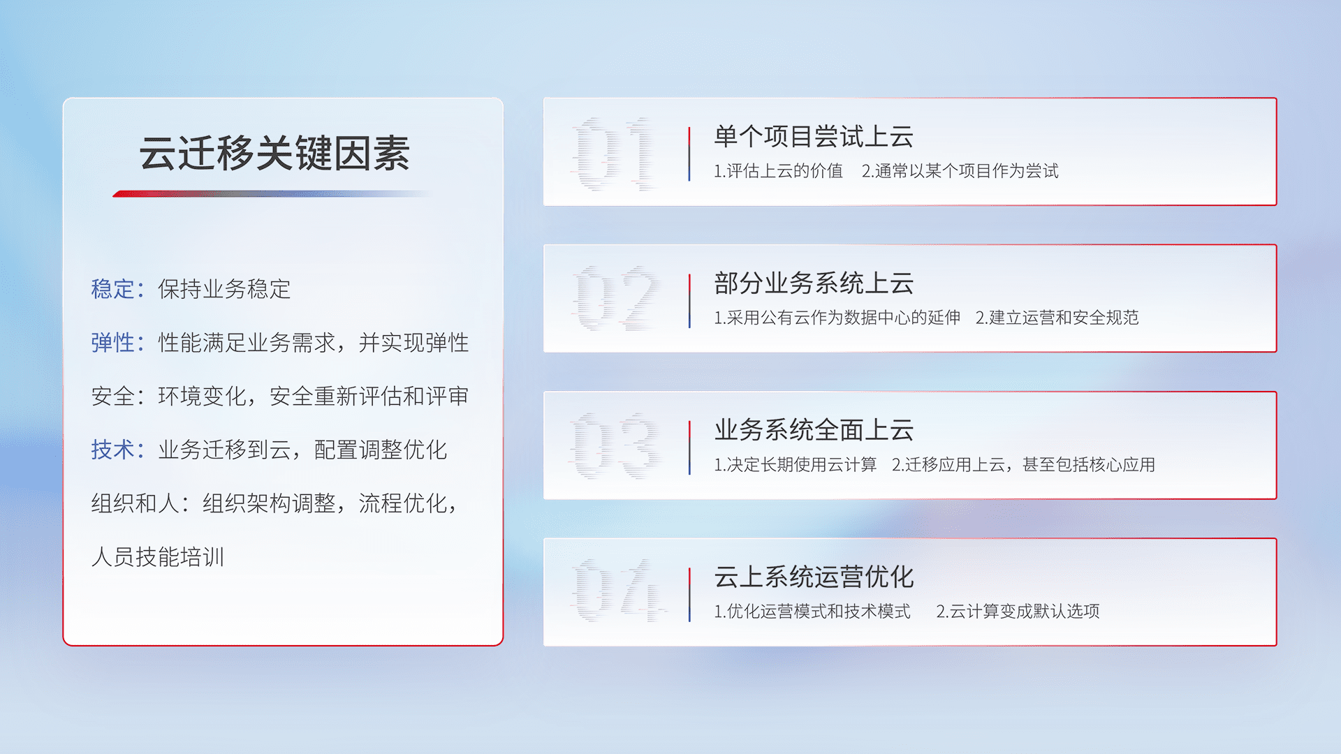 结合实际业务,,,,从规划设计、、、、云平台选型、、云原生改造、、、数据迁移、、、、集成交付,,迁移全过程为客户识别最佳上云路径,,,做好风险识别管理,,设计网络架构、、身份权限、、、、安全审计合规、、、操作审计、、、日志审计、、监控告警策略、、、、多站点容灾设计等,,,,对云上基础设施进行整体规划,,提升IT治理水平,,,,以满足弹性、、、高可用、、、、高性能的需求。。。。