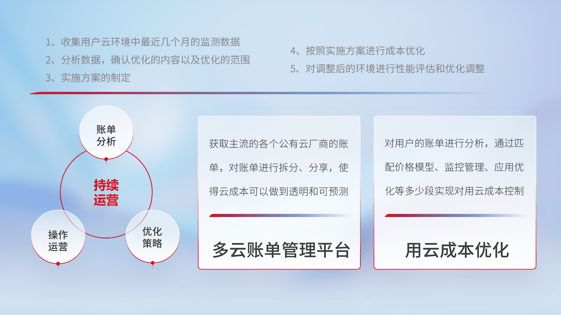 通过多云纳管,,以统一的资源数据模型把客户的云资源进行抽象和封装,,进而实现对多云资源的统一操作,,保障云资源管理的可靠性、、稳定性与可用性。。。量身定制化运维内容,,,,配置、、开发运维、、、、补丁管理、、、、备份、、、监控、、、、认证和访问管理、、、、审计和日常巡检等,,,,保障在用云过程中的可靠度,,稳定度以及高可用率。。